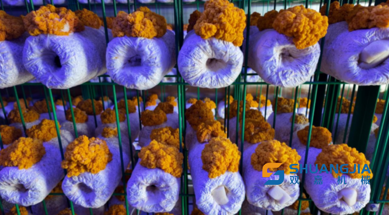 技术员介绍,金耳进了智能菇房,25天就能采收,全年都能出菇。光照不足时补光灯自动亮,湿度低了喷淋马上启动,一个菇房一茬能产4000斤。